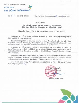 THƯ CẢM ƠN GỬI ĐẾN CÔNG TY 688 TỪ BỆNH VIỆN NHI ĐỒNG THÀNH PHỐ